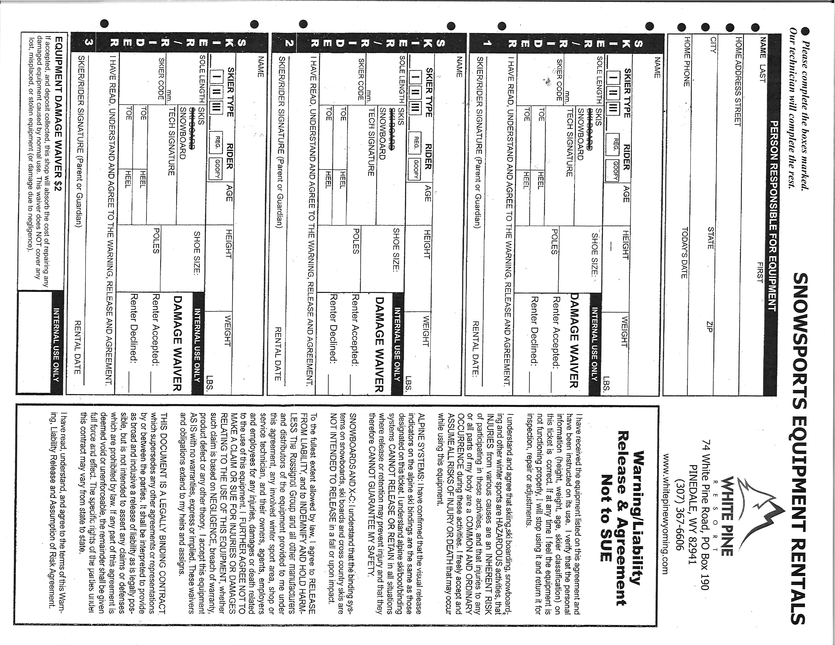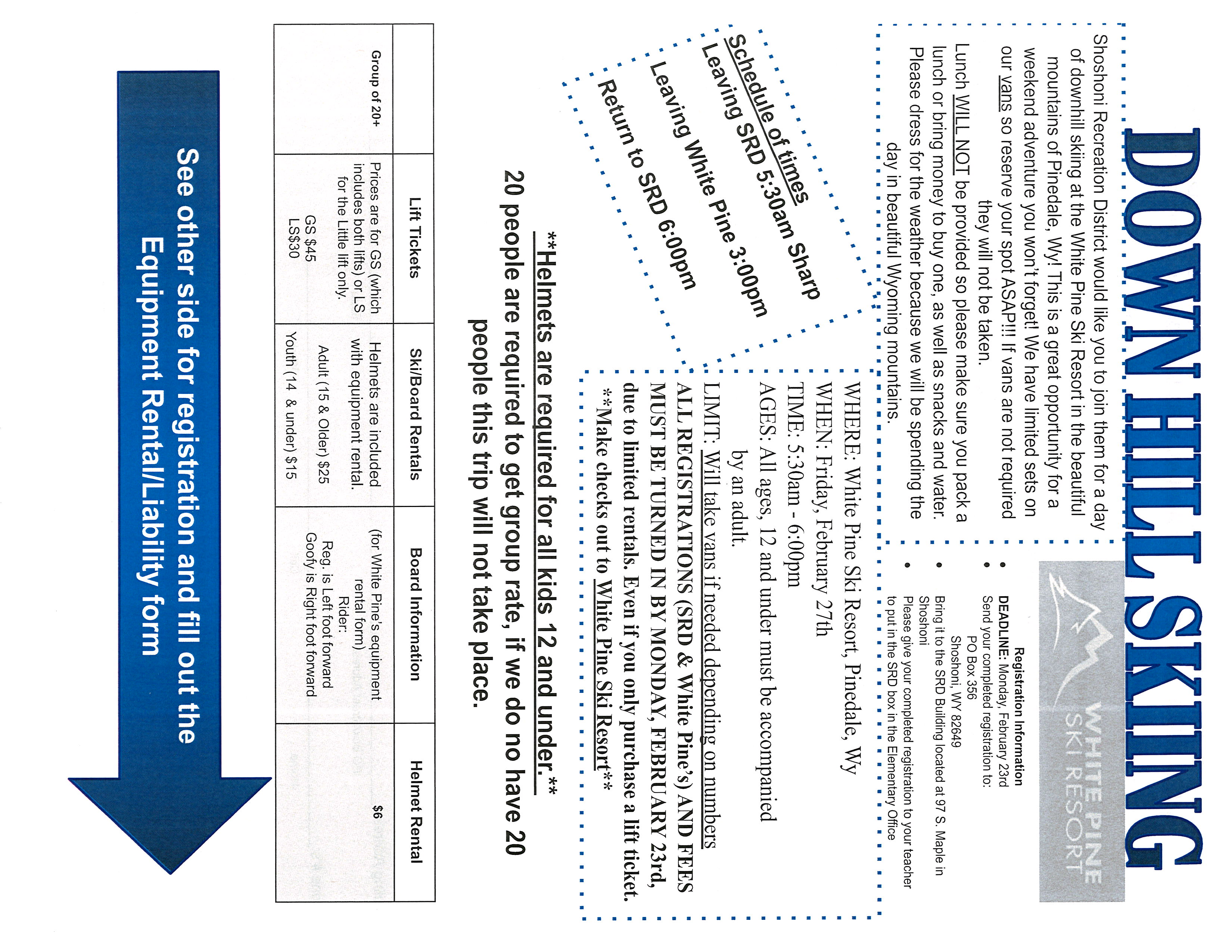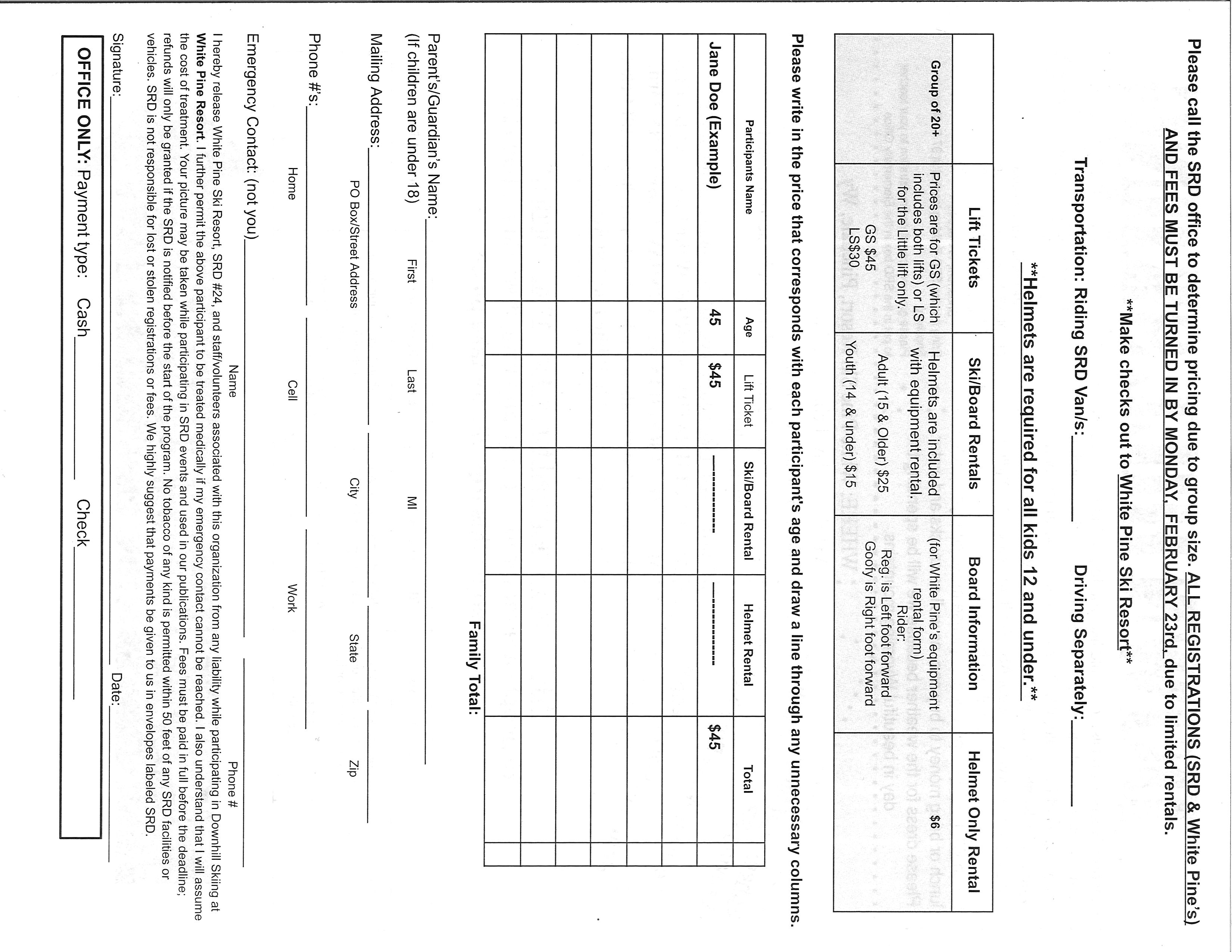 ALL REGISTRATIONS (SRD & White Pine's) AND FEES MUST BE TURNED IN BY MONDAY, FEBRUARY 23rd, due to limited rentals. Even if you only purchase a lift ticket.
