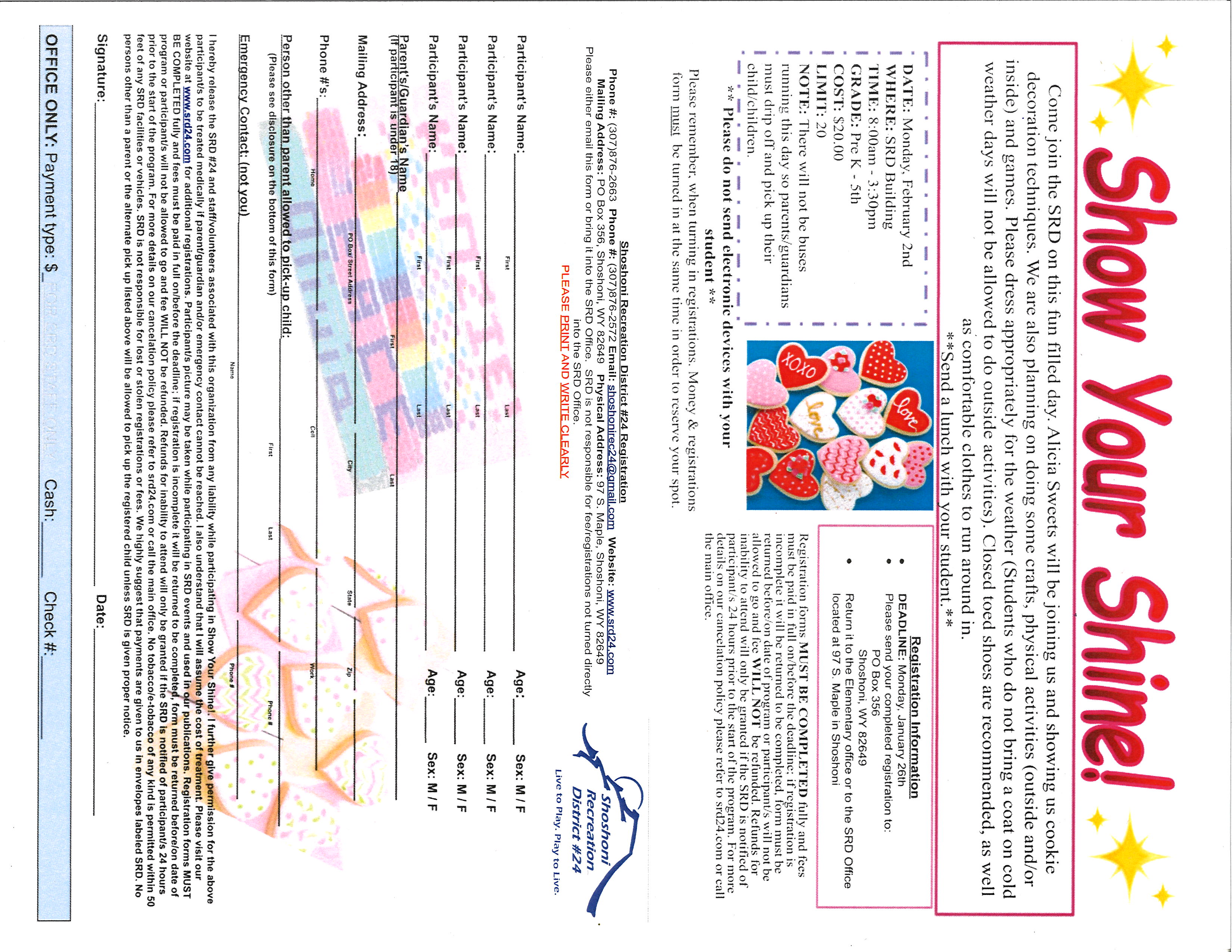 Come join the SRD on this fun filled day. Alicia Sweets will be joining us and showing us cookie decoration techniques. We are also planning on doing some crafts, physical activities (outside and/or inside) and games. Please dress appropriately for the weather (Students who do not bring a coat on cold weather days will not be allowed to do outside activities). Closed toed shoes are recommended, as well as comfortable clothes to run around in.